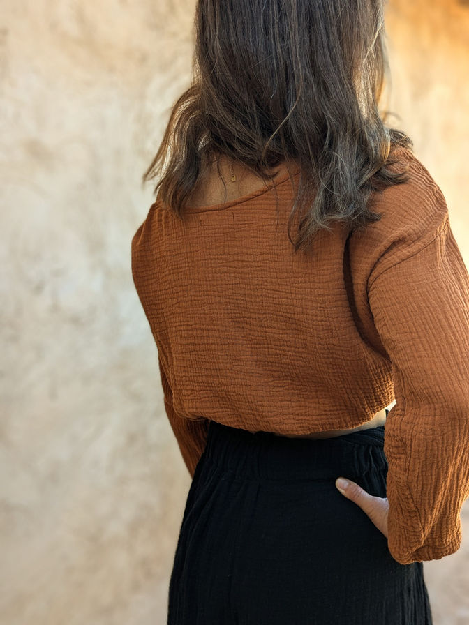 The Ana Blouse is a charming piece that brings a touch of sweetness to your wardrobe. In a rich rusty brown, it's the perfect color for autumn. This blouse features a unique boot cut design and straight arms, offering a fresh twist on classic styles. Crafted from soft muslin, it's incredibly comfortable—ideal for everyday wear.